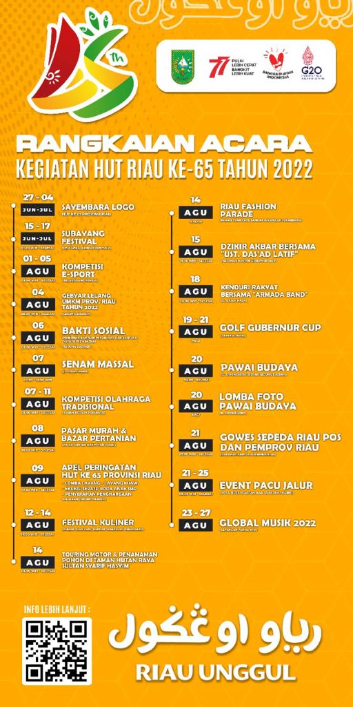 Adapun sejumlah kegiatan yang sudah berlangsung dan bakal digelar dalam rangka Hari Jadi ke 65 Provinsi Riau yaitu: