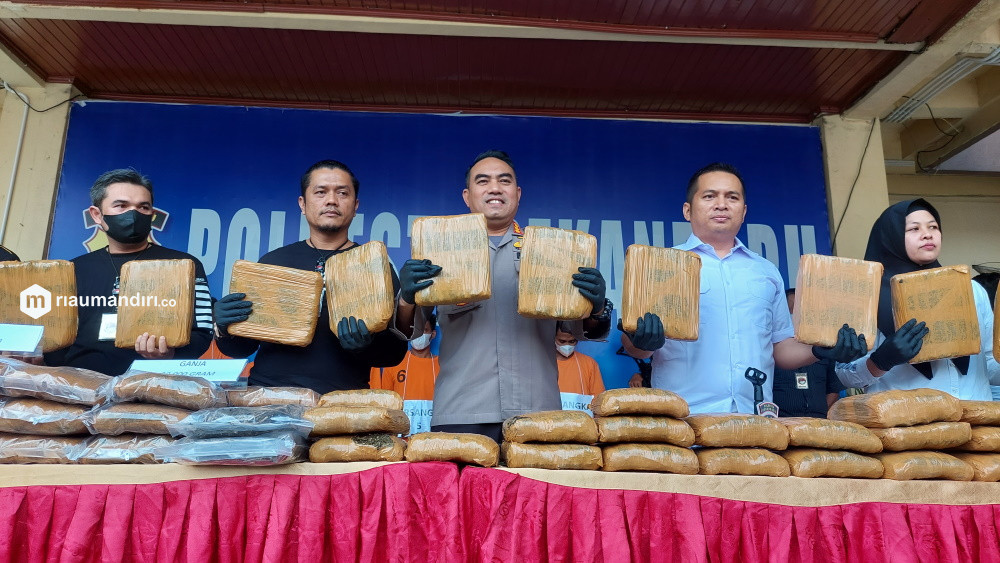 RIAUMANDIRI.CO - Satuan Reserse Narkoba (Satresnarkoba) Kepolisian Resor Kota (Polresta) Pekanbaru menyita narkotika jenis ganja seberat 73 Kg. Barang haram itu disita dari 7 orang yang kini telah menjadi tersangka.