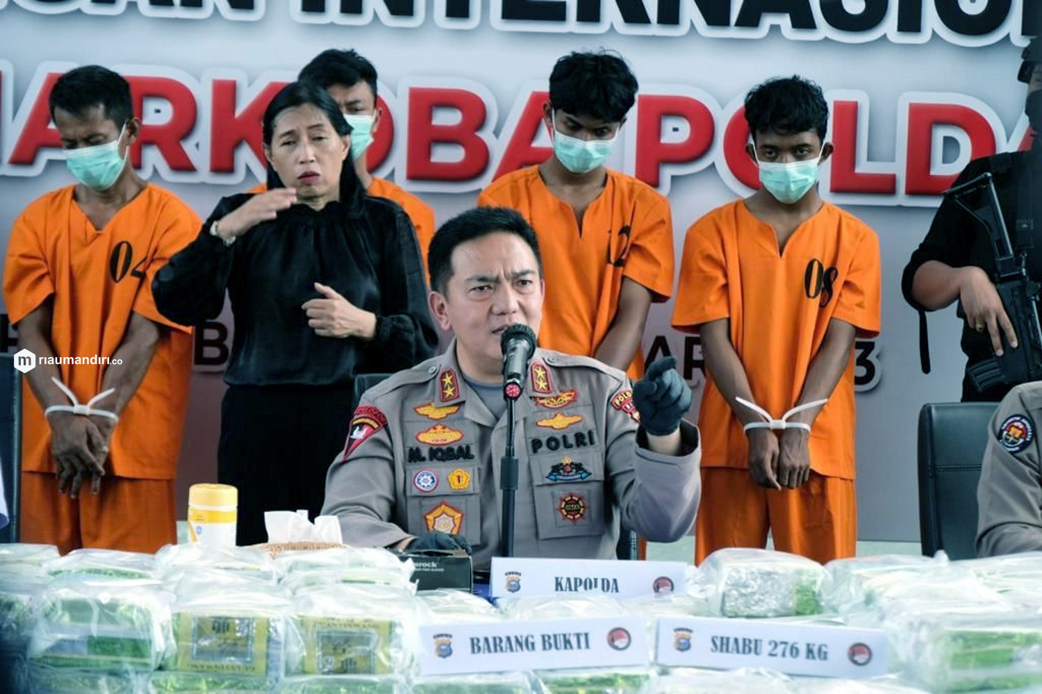 Dijelaskan Kapolda, barang bukti yang disita berupa narkotika jenis sabu seberat 276 Kg serta uang tunai sebesar Rp136.600.000 dari rekening pelaku. Narkotika ini kiriman dari Malaysia masuk ke Indonesia melalui wilayah Provinsi Riau.
