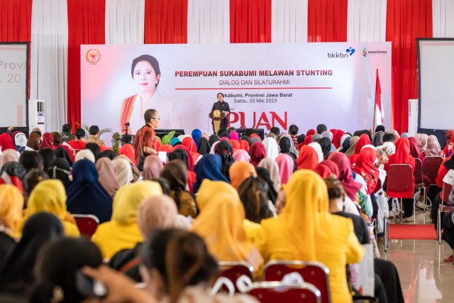 Dalam kunjungan kerjanya ke Sukabumi, Puan menghadiri kegiatan sosialisasi bahaya stunting bersama Kepala Badan Kependudukan dan Keluarga Berencana Nasional (BKKBN), Hasto Wardoyo di Gedung Harsa, Kota Sukabumi, Jawa Barat, Sabtu (20/5/2023). Acara tersebut bertajuk ‘Sukabumi Melawan Stunting’.