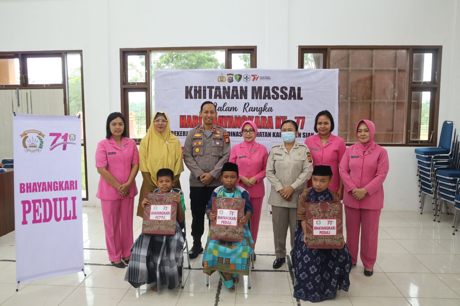 Kapolres Siak AKBP Ronald Sumaja melalui Wakapolres Siak Kompol Angga Wahyu Prihantoro menyampaikan, dihari Bhayangkara ke-77 ini pihaknya mengadakan Khitanan massal kepada puluhan anak dan orang tua yang menerima pengobatan secara gratis.
