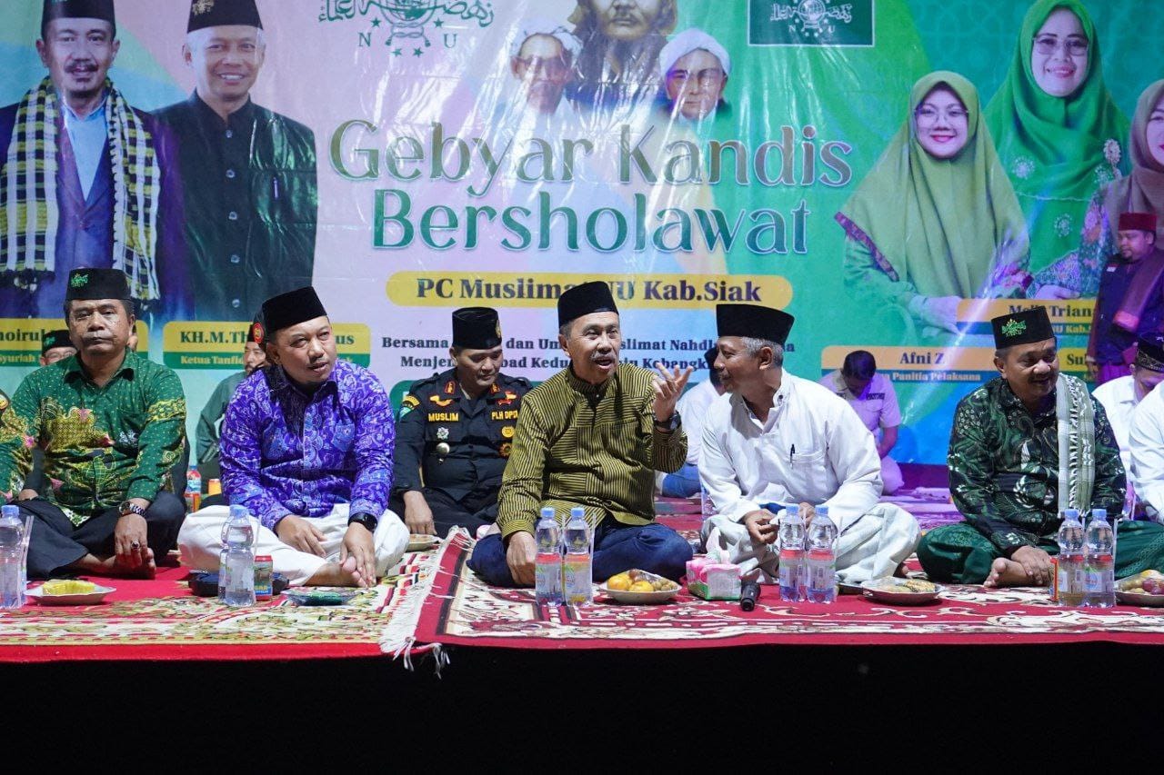 Riaumandiri.co - Dipimpin Ketua Tanfidiziyah PCNU Kabupaten Siak, KH Thoyib Firdaus, lantunan sholawat bergema hebat di Desa Garut, Kandis, Kabupaten Siak, Sabtu (12/8) malam. Kegiatan perdana Pengurus Cabang Nahdlatul Ulama bersama PC Muslimat NU Kabupaten Siak ini dihadiri ribuan jemaah dari berbagai kecamatan.