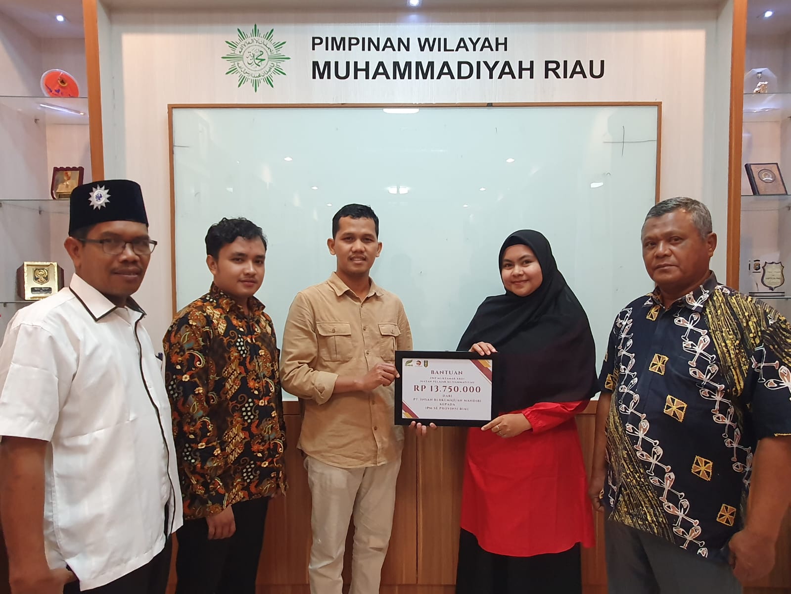 Bantuan secara simbolis langsung diserahkan oleh Marketing Executive PT. IBM Wilayah Provinsi Riau Taufik Hidayat, S.E kepada Bendahara PW IPM Riau IPMawati Nur Aziza di Kantor PWM Riau.