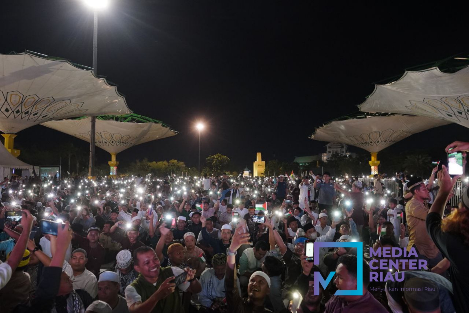 Riaumandiri.co - Tabligh akbar bersama Ustad Abdul Somad (UAS) bertema Penggalangan Dana dari Bumi Melayu Riau untuk Palestina di halaman Masjid Raya Annur Provinsi Riau dipadati puluhan ribu umat muslim, pada Jumat (10/11) malam.