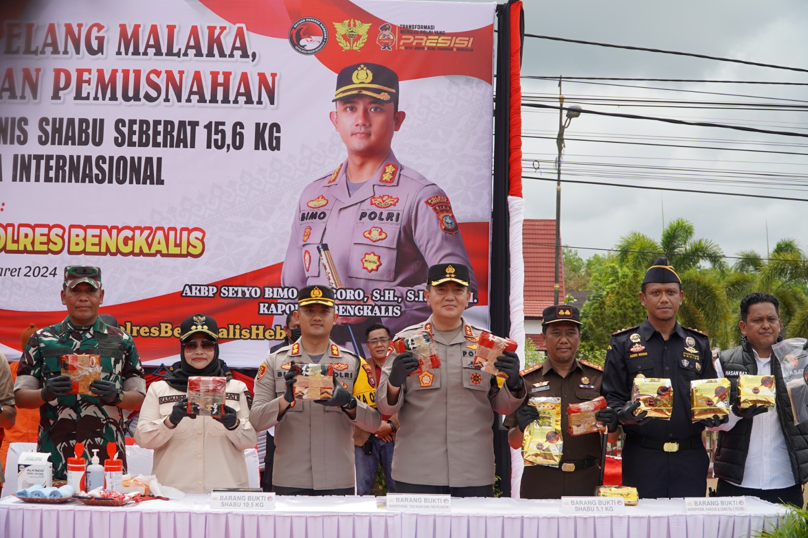 Riaumandiri.co - Kepolisian Resor (Polres) Bengkalis kembali menggagalkan peredaran narkoba dalam jumlah besar asal Malaysia. Kali ini, Korps Bhayangkara itu menyita narkoba jenis sabu seberat 15,6 kilogram dari tangan tiga orang tersangka di dua lokasi yang berbeda.