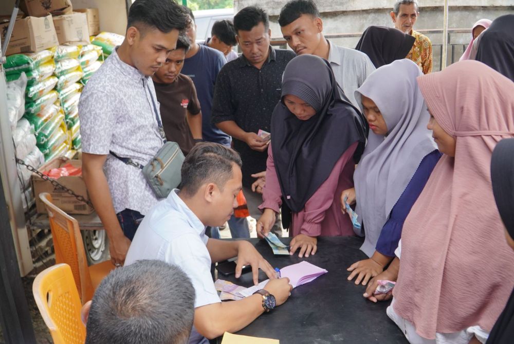 Riaumandiri.co - Pemkab Kampar menggelar operasi pasar murah, Bahan pokok yang dijual berada di bawah harga pasar, agenda ini berlangsung di halaman Kantor Desa Pulau Jambu Kecamatan Kuok.