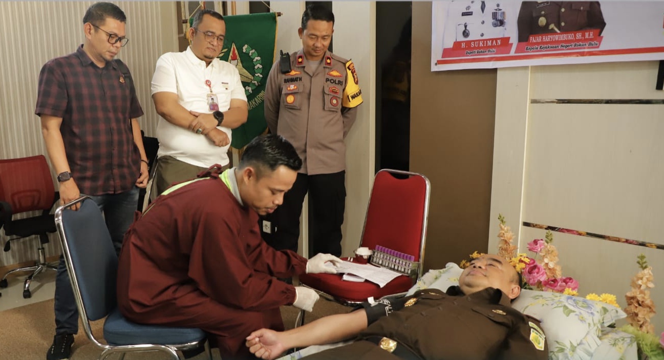 Riaumandiri.co - Kejaksaan Negeri (Kejari) Kabupaten Rokan Hulu (Rohul) bekerjasama dengan Palang Merah Indonesia (PMI) Kabupaten Rokan Hulu gelar bakti sosial berupa donor darah, Kamis (18/07).
