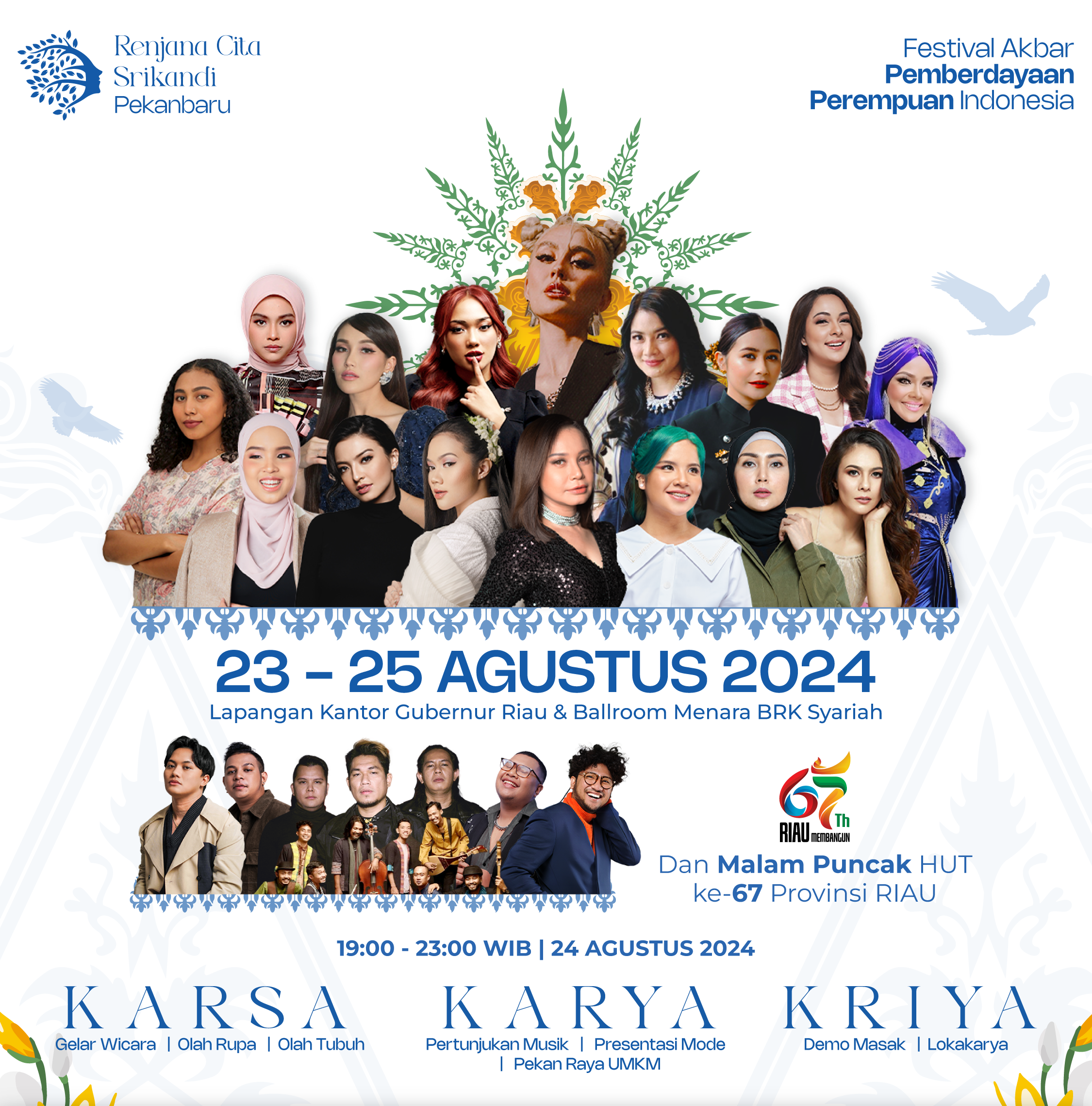 Festival Akbar Pemberdayaan Perempuan Indonesia yang akan berlangsung selama tiga hari di Lapangan Gubernur Riau dan Ballroom Menara BRK Syariah Riau ini akan dihadiri oleh lebih dari 70 perempuan inspiratif, termasuk Prilly Latuconsina, Yura Yunita, Rossa, Agnez Mo, Putri Ariani, Iyeth Bustami, GAC, Marion Jola, Mulan Jameela, Salma Salsabil, Fenita Arie, Tasya Farasya, Raline Shah, Chef Sisca Soewitomo, Chef Marinka, Chef Bu Rudy, Lenggogeni Faruk Halilintar, Ayu Ting Ting, Melody Laksani, Titi Kamal, Ghina Raihanah, Monalisa Sembor, dan banyak lagi. Dan pada hari kedua pelaksanaannya, yaitu Sabtu, 24 Agustus 2024, akan juga menjadi malam puncak perayaan Hari Ulang Tahun ke-67 Provinsi Riau yang akan turut dimeriahkan oleh Rizky Febian, Armada, Kunto Aji dan Mario G Klau.