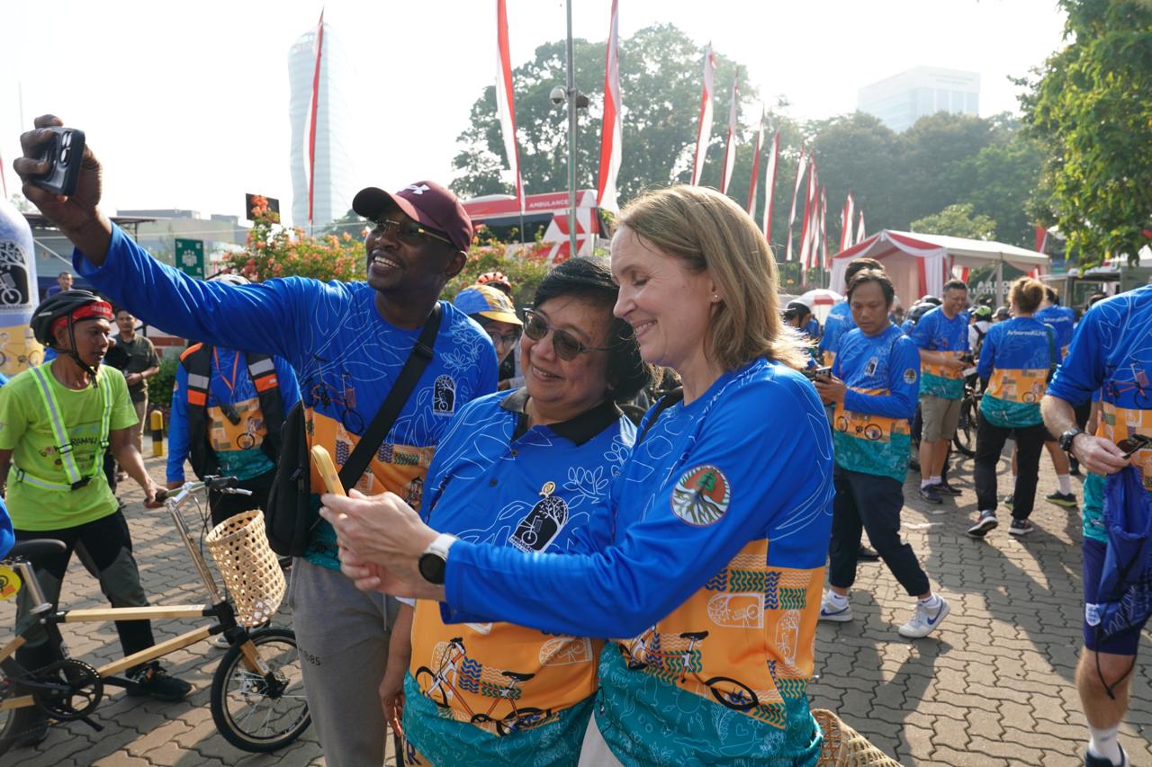 Bersama-sama dengan komunitas Bike to Work, para duta besar dan pimpinan organisasi internasional sebanyak 150 peserta mengayuh sepeda sejauh 7,5 km melintasi kawasan Car Free Day Jakarta.