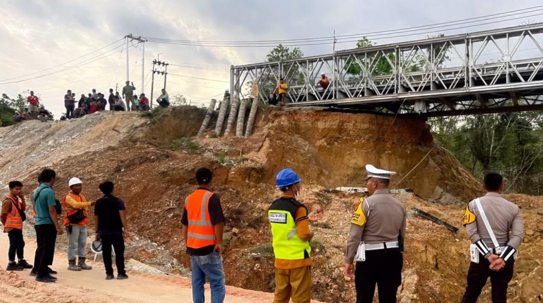Riaumandiri.co - Ruas jalan amblas KM 106/107 Desa Tanjung Alai Kecamatan XIII Koto Kampar yang menghubungkan Riau dan Sumatera Barat akhirnya ditutup total demi percepatan perbaikan jalur alternatif dilokasi jalan amblas maupun perbaikan akses jalan menuju Jembatan Bailey yang juga mengalami amblas.