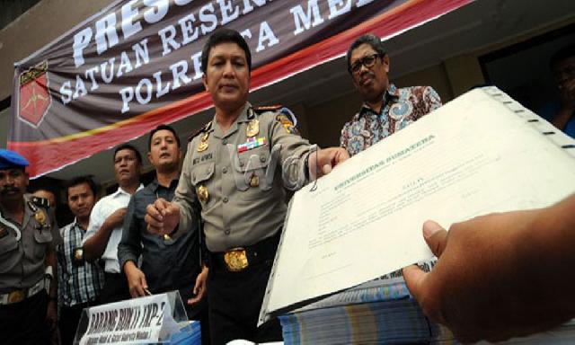 Kapolresta Medan Kombes Pol Nico Afinta menunjukkan plat untuk pembuatan ijazah palsu saat memberikan keterangan kepada wartawan di halaman Polresta Medan, Rabu (27/5). Polisi menyita sejumlah ijazah strata 2 (S-2) yang dikeluarkan oleh universitas swasta