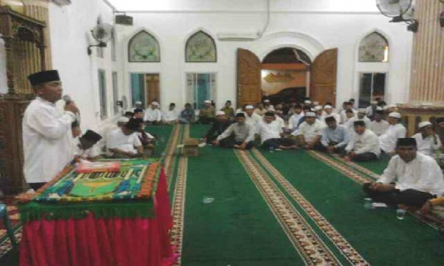 LANGGAM (HR)-Malam pertama bulan suci Ramadan 1436 H, Bupati H M Harris menunaikan salat Tarawih di Masjid Nurul Islam, Kecamatan Langgam, Rabu malam (17/6). Masjid ini terletak di kampung halaman orang nomor satu di Kabupaten Pelalawan ini.