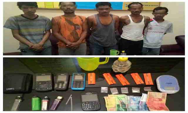 BANGKINANG (HR)- Polsek Tapung menangkap lima pria yang diduga tengah pesta sabu, Sabtu (11/7)di sebuah rumah milik MS alias G, di Desa Tanjung Sawit, Kecamatan Tapung.