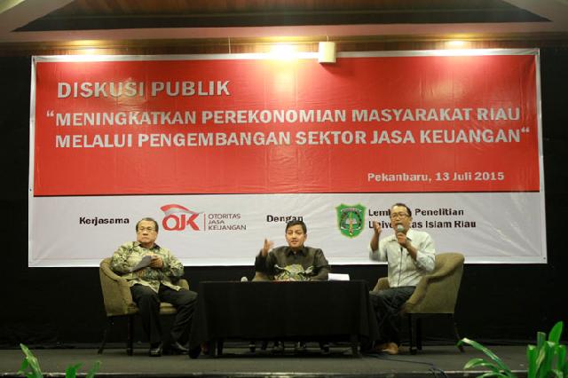 Hal itu dilontarkannya saat tampil sebagai narasumber dalam diskusi publik yang mengangkat tema Meningkatkan Perekonomian Masyarakat Riau Melalui Pengembangan Sektor Jasa Keuangan, Senin (13/7) di Hotel Pangeran Pekanbaru. Kegiatan tersebut ditaja Otoritas Jasa Keuangan (OJK) bekerjasama dengan Lembaga penelitian Universitas Islam Riau (LP UIR). Diskusi tersebut juga menampilkan narasumber lain, Wakil Ketua Dewan Komisioner OJK, Rahmad Waluyanto.