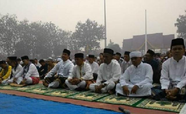 PANGKALAN KERINCI (HR)- Bupati Pelalawan HM Harris bersama masyarakat Kabupaten Pelalawan Kamis (24/9) melaksanaan Salat Hari Raya Idul Adha lapangan bola, Pangkalan Kerinci. Kendati Pelalawan diselimuti kabut asap, namun tidak menyurutkan niat untuk melaksananakan salat berjamaah.