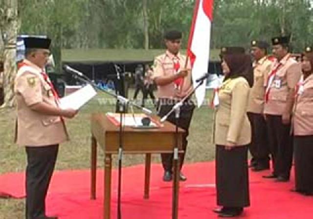 PERHENTIAN RAJA (HR)-Ketua Kwartir Cabang Gerakan Pramuka 03 Kampar Hj Eva Yuliana Jefry secara resmi melantik Ketua Majelis Ranting (Kamabiran) serta pengurus Kwartir Ranting (Kakwaran) Gerakan Pramuka Kecamatan Perhentian Raja, Rabu (21/10) di halaman Kantor Camat Perhentian Raja.