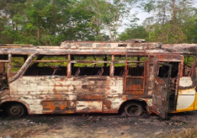 PANGKALAN KURAS (HR)- Mobil jenis bus mengangkut sebelas penumpang terbakar di jalan lintas Timur KM 98/99 Desa Terantang Manuk, Kecamatan Pangkalan Kuras, Rabu (4/11) malam, sekira pukul 21.00 WIB.