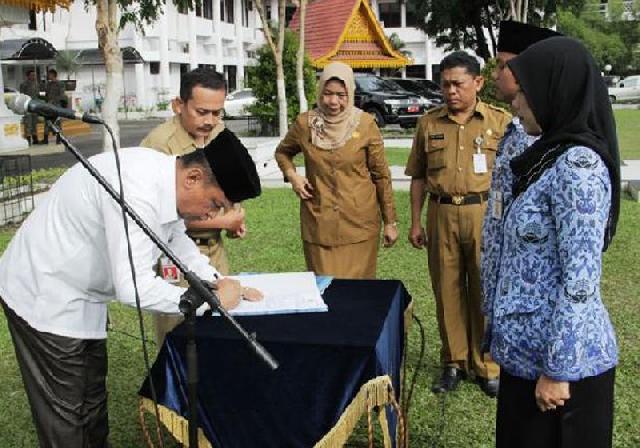 PEKANBARU(HR)-Pemerintah Kota Pekanbaru menggelar kegiatan mengambil sumpah dan janji dari 28 orang Pegawai Negeri Sipil, Selasa (17/11). Hal itu dilaksanakan sesuai dengan amanah Undang- undang No.5 tahun 2014, tentang Aparatur Sipil Negara.