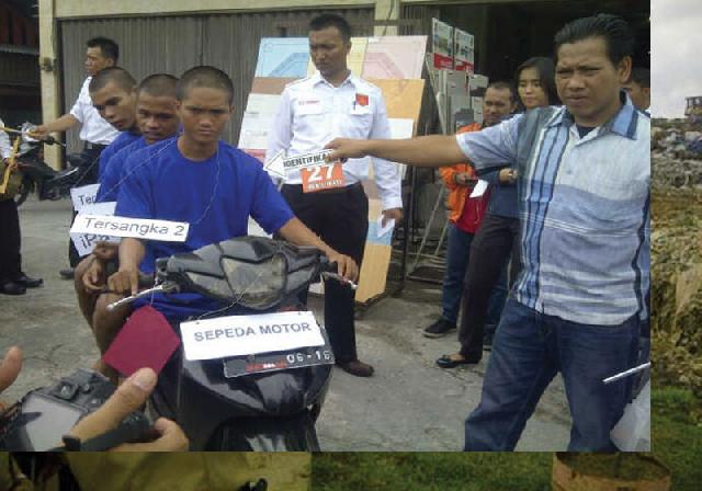 Rekontruksi ini diperagakan langsung oketiga tersangka, Jefry Yandi (19), Ahmad Remon (20) dan KA alias Irul (17) didampingi oleh penyidik Mapolsek Tampan.