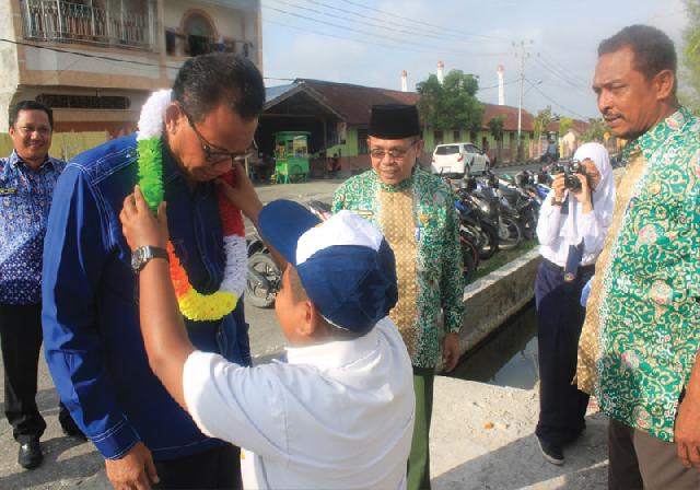 Bupati H Suyatno diberikan kalungan bunga oleh Pelajar SMPN1 Bangko saat hadiri untuk melantik pengurus OSIS, Kamis pagi.