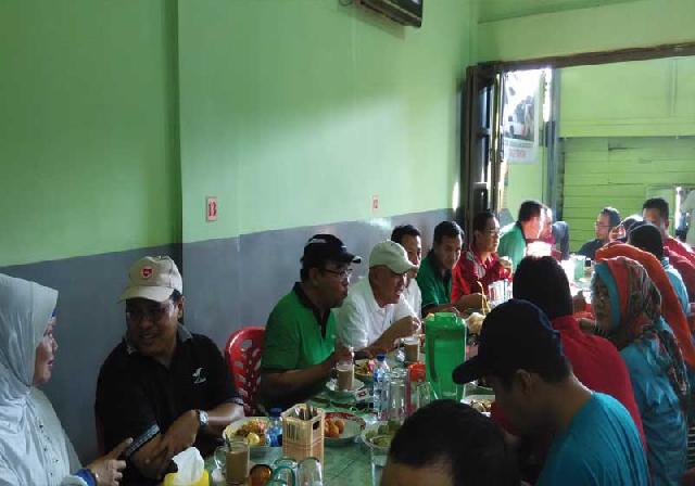 Usai dua kali mengelilingi area Masjid Agung Annur sembari bincang santai membahas berbagai hal, puluhan alumni HMI ini menuju salah satu kedai lontong tidak jauh dari areal masjid untuk sarapan pagi. Acara bincang-bincang pagi itu makin heboh ketika Plt Gubernur Riau, Arsyadjuliandi Rachman ikut bergabung sarapan.