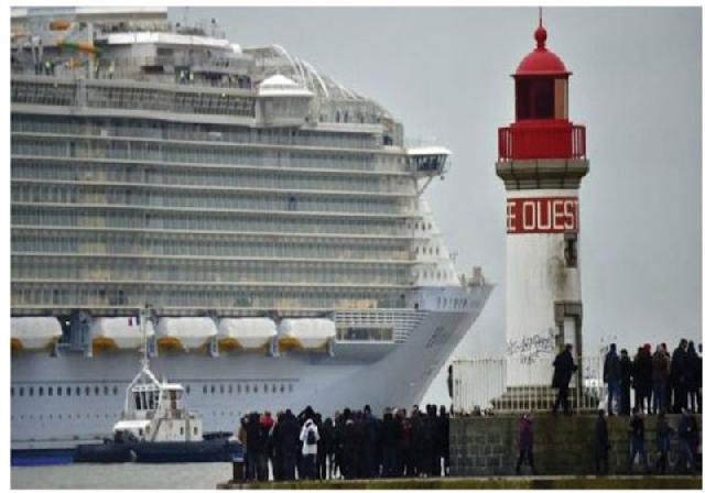 Ribuan orang berkerumun untuk menonton di pelabuhan Saint-Nazaire, saat kapal yang tingginya mencapai 70 meter itu dipandu ke laut oleh enam kapal tunda pada hari Kamis.