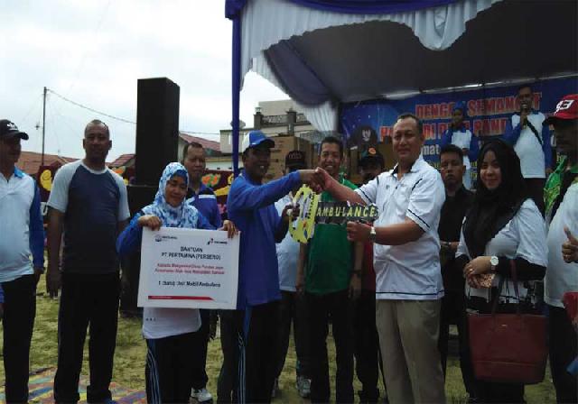 Saat pembagian hadiah dan pencabutan doorprize juga digelar penyerahan satu unit mobil ambulans secara simbolis oleh anggota Komisi VI DPR RI, Nurzahedi atau Eddy Tanjung.