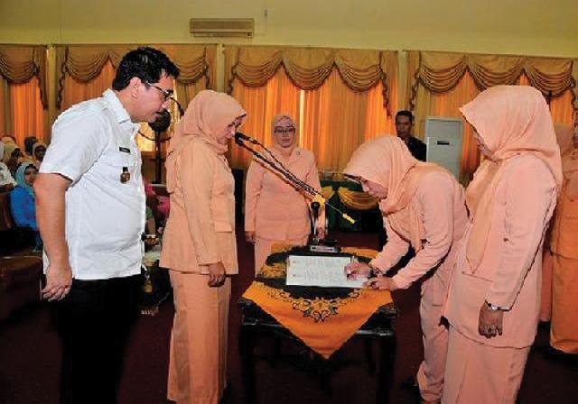 RENGAT (riaumandiri.co) -Risma Agustina Junaidi dikukuhkan sebagai Ketua Kepengurusan Dharma Wanita Kabupaten Inhu periode 2014-2019. Pengukuhan tersebut dilakukan langsung oleh Ketua Dharma Wanita Prov Riau Sriwahyuni Irwan di Gedung Graha Wanita Rengat.