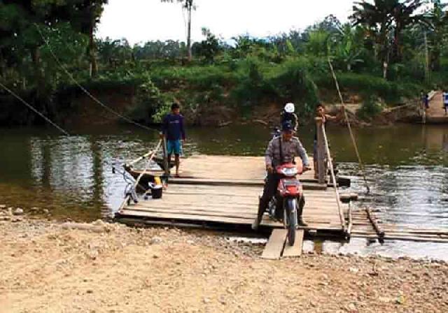 Selain rakit terbuat dari papan, bantuan dari BPBD Rohul pada 2014 juga lengkap dengan sling atau kawat. Saat banjir besar lalu, rakit sengaja ditenggelamkan warga dan baru dipakai lagi untuk menyebrang setelah jembatan kayu hanyut diterjang banjir besar.