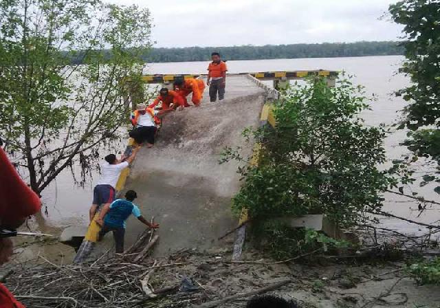 Pantauan di lapangan, Kamis (12/5), sejumlah petugas Timsar, BPBD maupun anggota TNI yang hendak mencari jasad bocah yang hilang dimakan buaya tampak kesulitan naik untuk menuju dermaga. Robohnya jembatan pelabuhan itu, dikarenan pondasinya yang tidak kuat karena habis dimakan abrasi sungai Rokan.