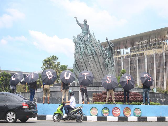 Mereka juga membawa sejumlah payung hitam, sebagai tanda kelamnya penegakan hukum terhadap perusahaan terduga 'biang asap' di Riau tahun 2015 lalu. Pada masing-masing, berisi huruf. Bila disatukan, payung-payung itu akan membentuk kalimat berbunyi: 'Cabut SP3'.