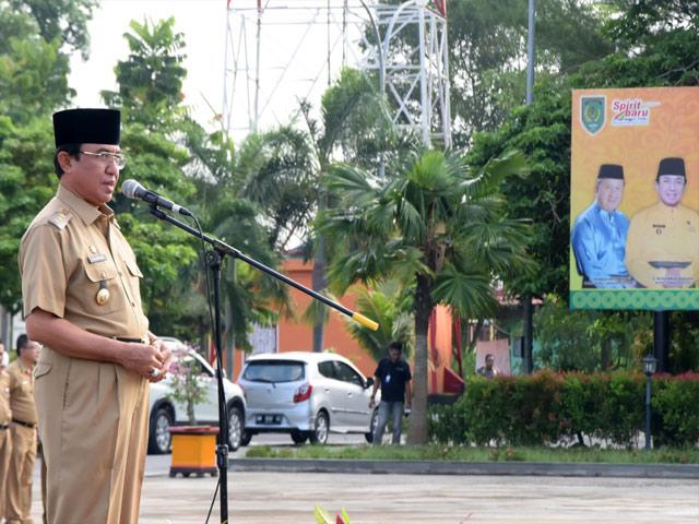 TEMBILAHAN (RIAUMANDIRI.co)-Bupati Kabupaten Indragiri Hilir HM Wardan memimpin apel hari pertama masuk kerja pasca Idul Adha 1437 H, Senin (13/9), bertempat di halaman Kantor Bupati di Tembilahan.
