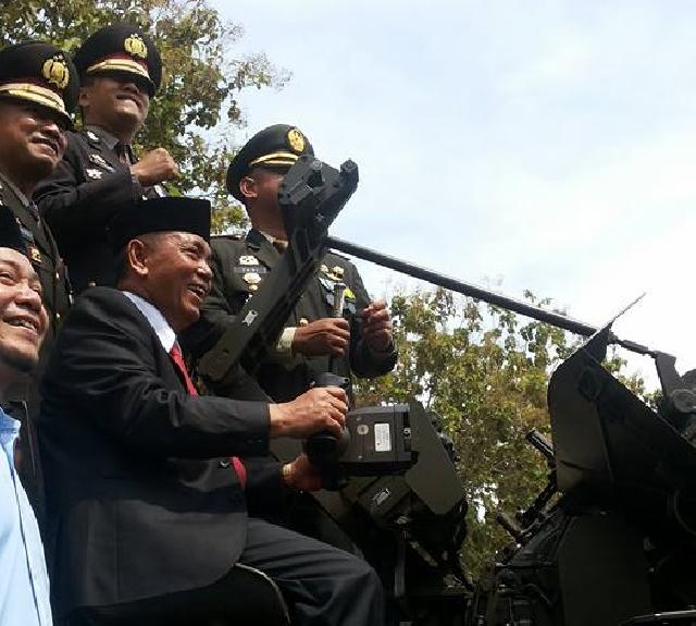 Bupati Harris saat mencoba memeragakan jadi operator meriam milik TNI saat HUT TNI pada 5 Oktober lalu (Foto: Pendi)