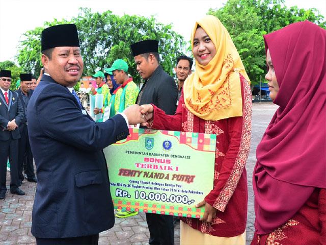 Bonus langsung diserahkan Bupati Bengkalis Amril Mukminin, disaksikan Wakil Bupati Bengkalis Muhammad, Ketua Umum KONI Bengkalis Syaukani, Dandim 0303 Bengkalis Letkol Inf Rizal Faizal Helmi, Ketua KNPI Irmi Syakip Arsalan, Plt Sekretaris Daerah Arianto.