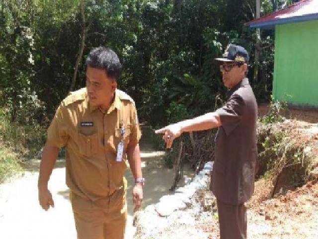 Mursini bersama Kabag Ekbang, Ade Fahrer Arif meninjau tebing kritis yang hampir merobohkan gedung PAUD di Petapahan, Senin (21/11).