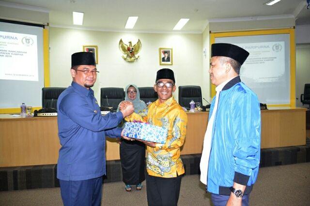 Syahrial Abdi menyerahkan Ranperda APBDP Kabupaten Kampar Tahun Anggaran 2016 kepada Ketua DPRD (Foto: Humas)