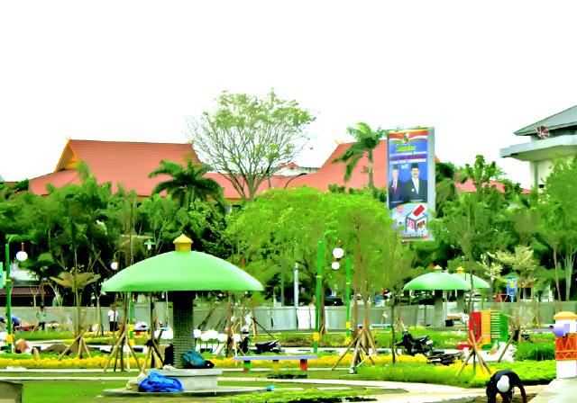 Hampir Rampung-Pembangunan Taman Kota di depan Kantor Walikota Pekanbaru terlihat hampir rampung. Taman Putri Kaca Mayang ini diharapkan dapat menjadi tempat rekreasi masyarakat di Kota Pekanbaru sekaligus sebagai Ruang Terbuka Hijau (RTH).