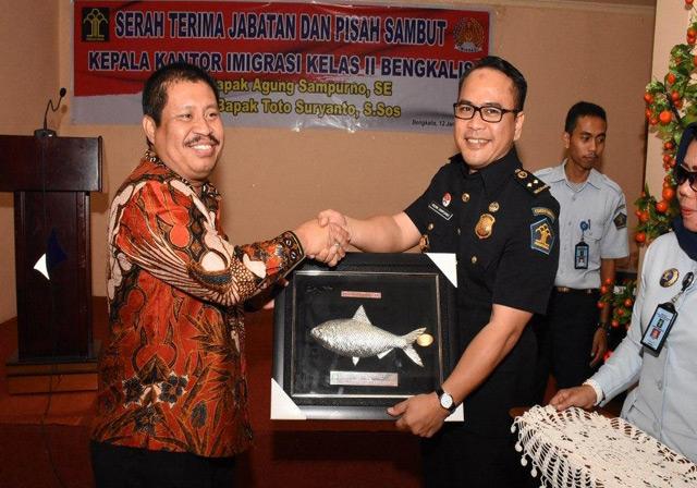 “Baik atas nama pribadi, keluarga, maupun Pemerintah Kabupaten Bengkalis, kami mengucapkan selamat datang dan selamat bertugas di Kabupaten Bengkalis, kepada Bapak Toto Suryanto, beserta istri dan keluarga. Serta, kami juga mengucapkan selamat bertugas di tempat yang baru kepada Bapak Agung Sampurno yang akan menjadi Kepala Bagian Hubungan Masyarakat (Kabag Humas) di Direktorat Jenderal Imigrasi, Jakarta,” ucapnya.