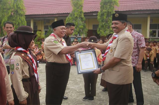 SIAK (riaumandiri.co)- Wakil Bupati Siak Alfedri selaku Ketua Kwarcab 09 Gerakan Pramuka Siak, Kamis (19/1/) pagi, menyerahkan piagam penghargaan Gugus Depan 09 001(Putra) dan Gugus Depan Siak 09 002 (Putri) berpangkalan kepada SDN 01 Lubuk Dalam.