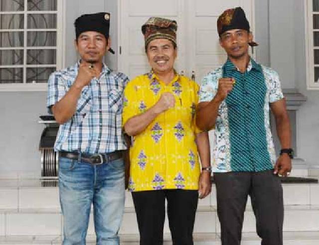 Bupati H Syamsuar tampak mengenakan tanjak, saat menyambut salah satu tamu, beberapa waktu lalu.