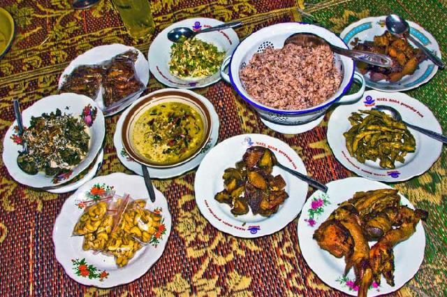 Hidangan datang, diantar langsung ke hadapan kami yang duduk di atas lincak, ini hal baru bagi kami, karena lesehan biasa bertempat di lantai. Hidangan lengkap menggugah selera ini terdiri dari: nasi merah, empal, usus goreng, ayam goreng, wader goreng, sayur lombok ijo dan trancam. Nasinya empuk dan gurih, berbeda dengan yang biasa kami makan.