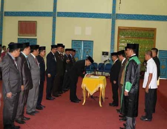 PELALAWAN (RIAUMANDIRI.co) - Bupati Pelalawan HM Harris resmi melantik dan mengambil sumpah janji jabatan 11 Pimpinan Tinggi Pratama di Lingkungan Pemerintah Kabupaten (Pemkab) Pelalawan tahun 2017, Rabu (8/2)di Gedung Daerah Laksamana Mangkudiraja.