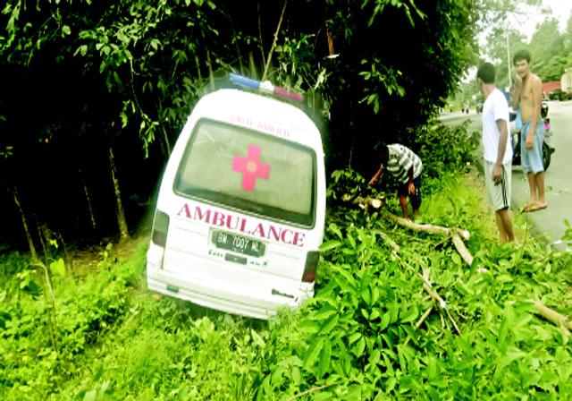 RAMBAH HILIR (riaumandiri.co) - Ambulans Nopol BM 7007 ML milik Klinik Bunda Kecamatan Kabun mengalami kecelakaan lalulintas (Laka) tunggal di jalan lintas Provinsi Riau, tidak jauh depan rumah makan H. Alung di Dusun Kumu Sejati Desa Rambah Kecamatan Rambah Hilir Kabupaten Rokan Hulu (Rohul) Jumat, (10/3) siang.