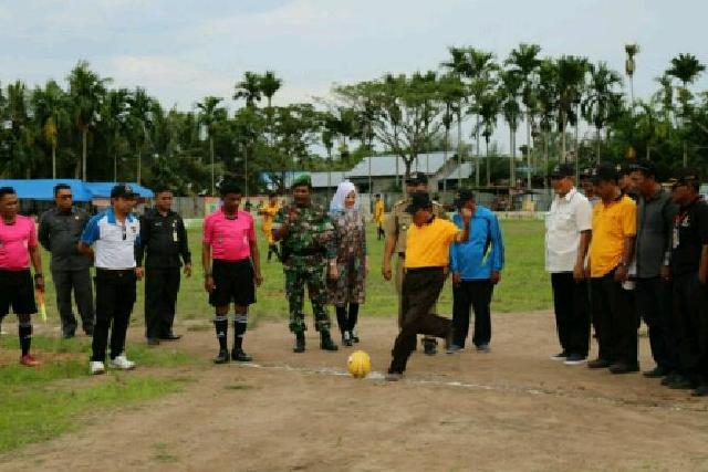 Bupati Wardan melakukan tendangan bola pertama, saat pembukaan Turnamen Reteh Cup, kemarin.