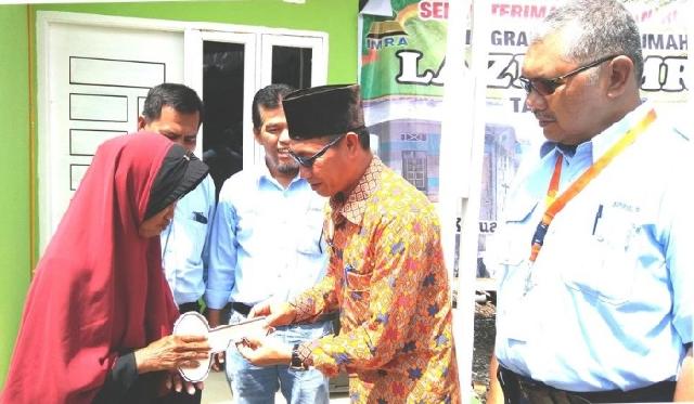 Lurah Kerinci Timur, Edi Arifin menyerahkan secara simbolis kunci rumah kepada Ati, warga Pangkalan Kerinci yang mendapatkan bantuan rumah. Ati sangat bahagia karena Lazis IMRA PT RAPP memberikan bantuan bedah rumah kepadanya
