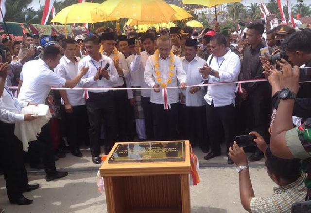 Gubernur Riau Arsyadjuliandi Rachman, memotong pita tanda diresmikan jembatan Kota Lama, Kecamatan Kunto Darussalam, Kabupaten Rokan Hulu (Foto: RMC/Nurmadi)