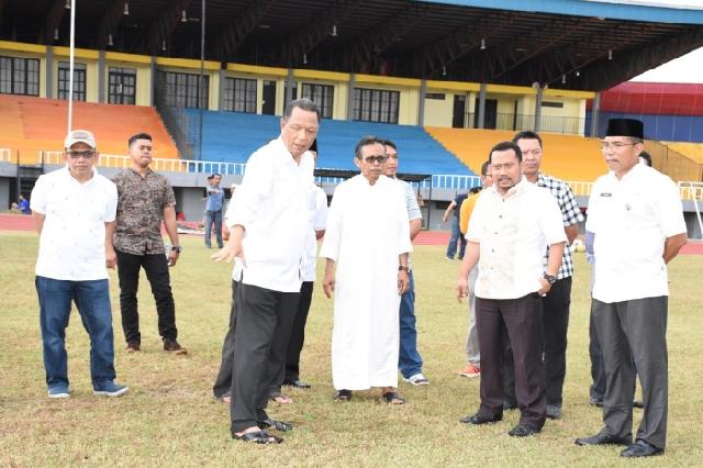 UPATI Kampar Azis Zaenal didampingi Wabub Catur Sugeng Susanto dan rombongan meninjau Stadion Tuanku Tambusai salah satu venue yang akan digunakan pada Porprov IX
