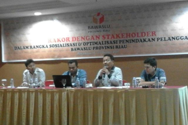 Anggota Bawaslu Riau Neil Antariksa menyampaikan sambutan saat membuka Rakor dengan Stakeholder (Foto: RMC/Moralis)
