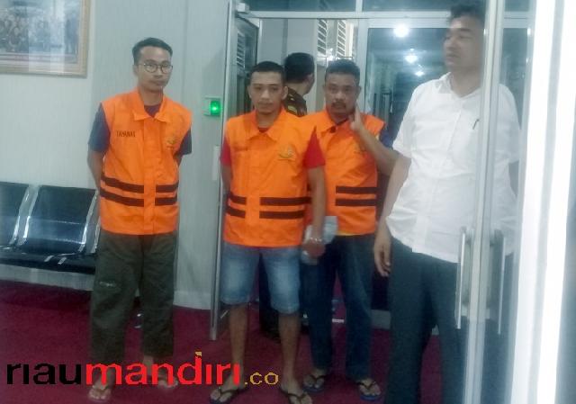 Tiga tersangka saat hendak dibawa dari Kejati Riau menuju tahanan (Foto: RMC/Dodi)