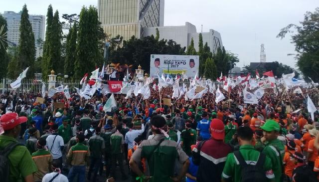 Unjuk rasa buruh di depan Kantor Gubernur Riau terkait Permen LHK No.17/2017 (dok. RMC)
